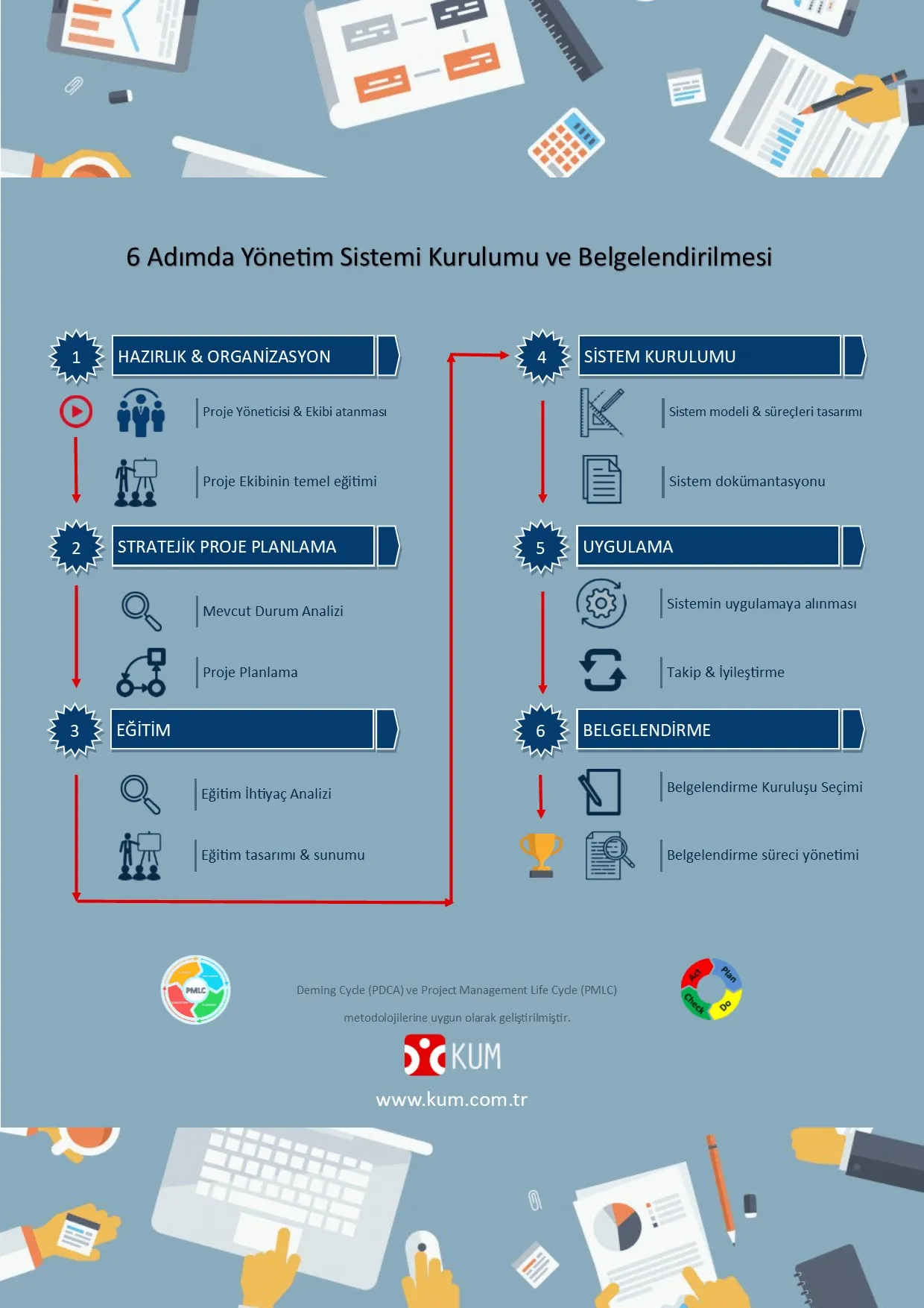 Danışmanlık projelerimiz; Deming Cycle (PDCA) ve Project Management Life Cycle (PMLC) ilkelerinin yaklaşık 30 yıllık deneyimle harmanlanması sonucu geliştirdiğimiz ve KUM-CPM Yazılımımız ile desteklediğimiz KUM PROJE YÖNETİM METODOLOJİSİ çerçevesinde planlanmakta ve yönetilmektedir.