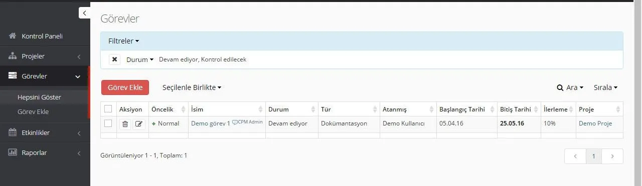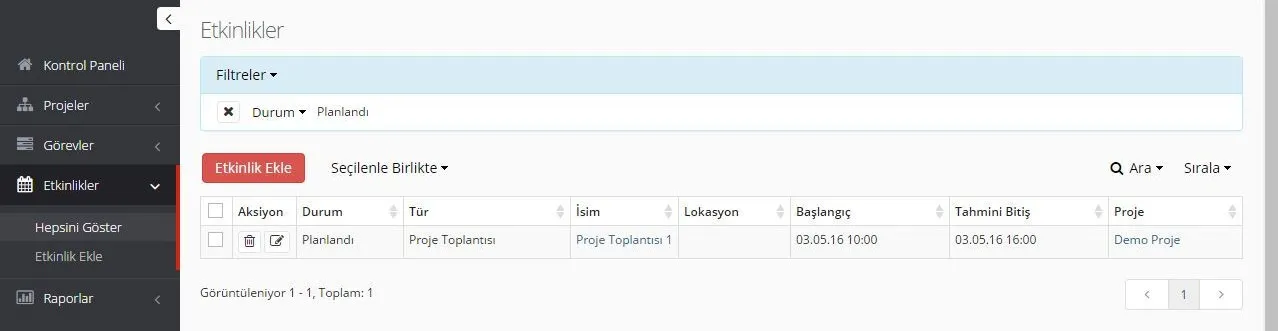 Proje ile ilgili belirlenmiş olan tüm görev ve etkinliklere ilişkin detaylar, eklenmiş dokümanlar, terminler, sorumlular tek ekranda filtrenebilir şekilde görüntülenebilir ve yönetilebilir.
