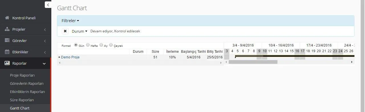 Proje ile ilgili faaliyetlere ilişkin basit ve özet raporlar ile proje durumunu görüntülenebilir. Üstelik Gantt Chart desteği ile.