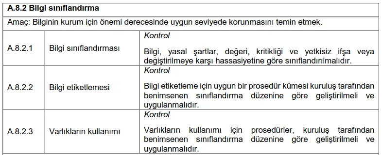 ISO27001:2013 Standardı Ek A.8.2 maddesi, Bilgi Sınıflandırma ile ilgili temel kontrolleri ve bunların amaçlarını şöyle tanımlıyor: