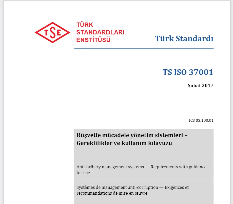 ISO tarafından uluslararası standart olarak yayınlanan ISO37001:2016 standardı, ülkemizde TSE (Türk Standartları Enstitüsü) tarafından 06.02.2017 tarihinde "Türk Standardı" olarak da kabul edildi ve TS ISO 37001:2017 olarak (İngilizce metin- orjinal ISO37001:2016) yayınlandı.